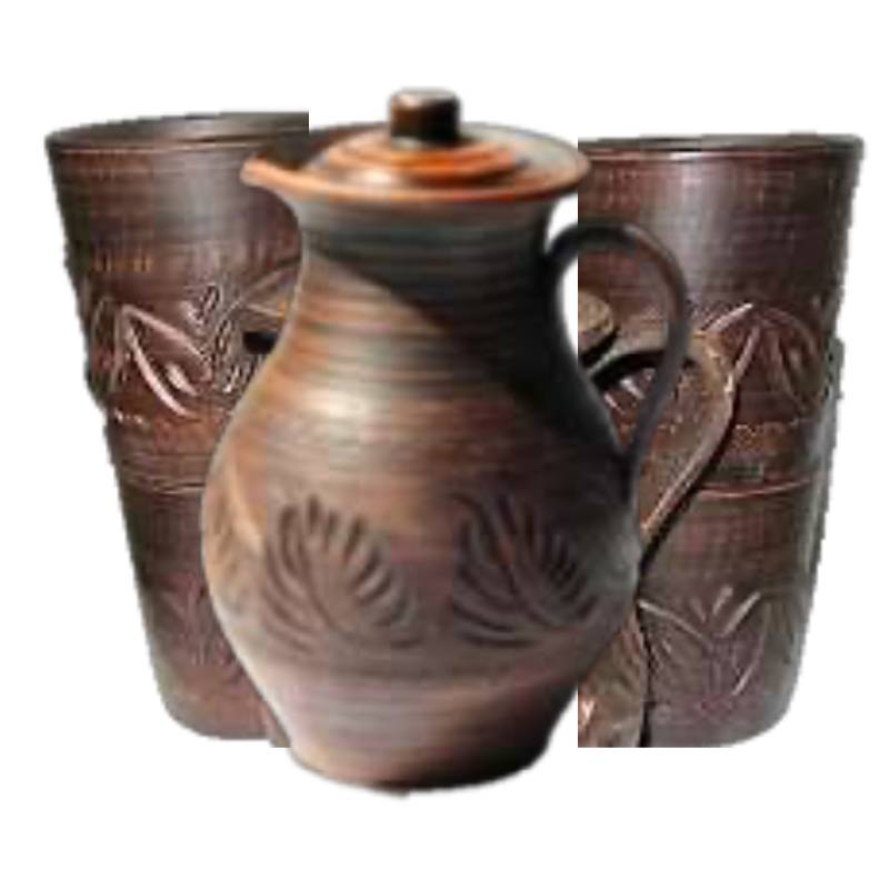 Dzbanek z pokrywką, 3 litra, + 4 filiżanki, czerwona glina