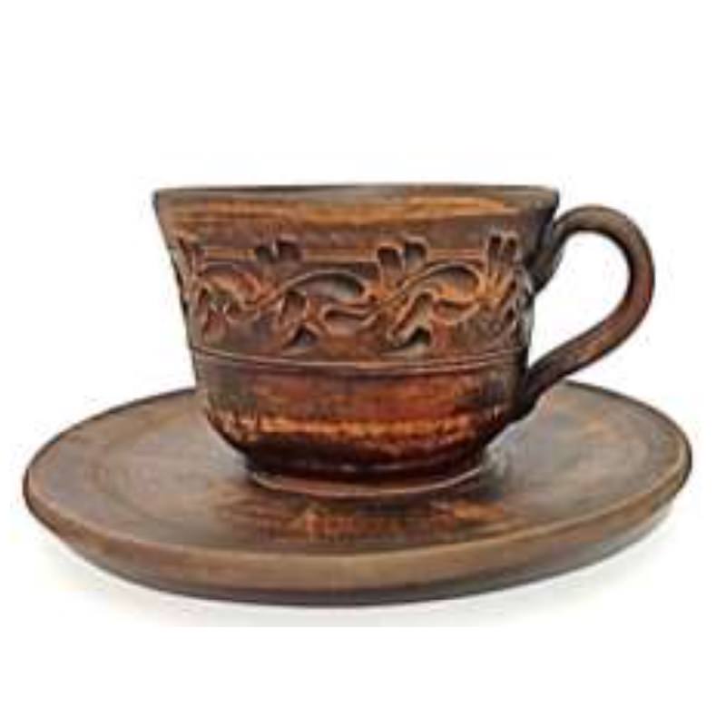 Kubek do kawy, dekorowany + podstawka, czerwona glina