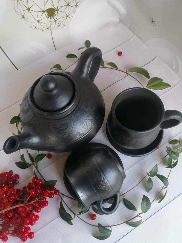 Zestaw: Czajnik i 2 kubka, czarna glina