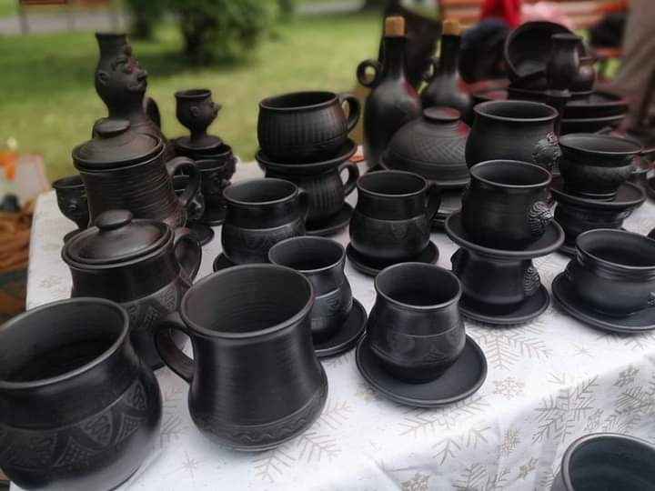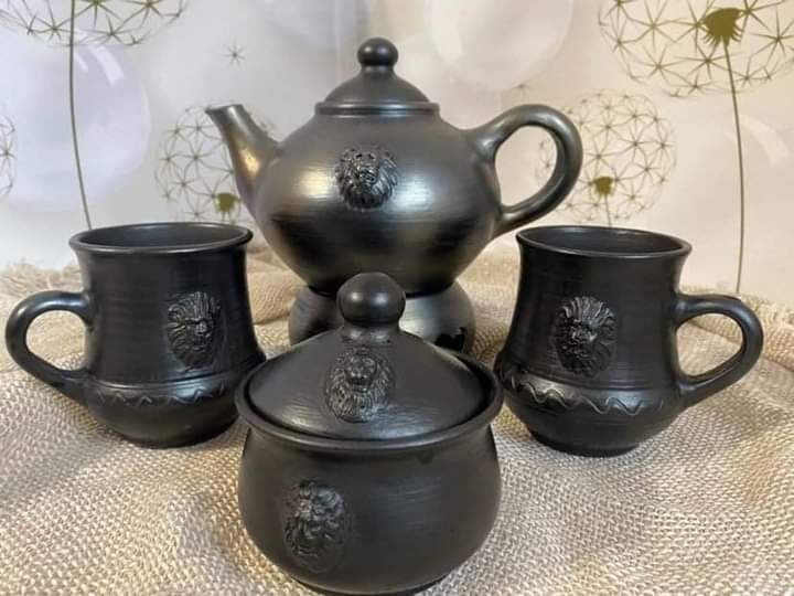 Zestaw dzbanek + 2 kubka + cukiernica, czarna glina